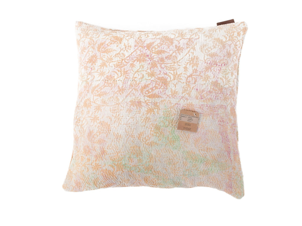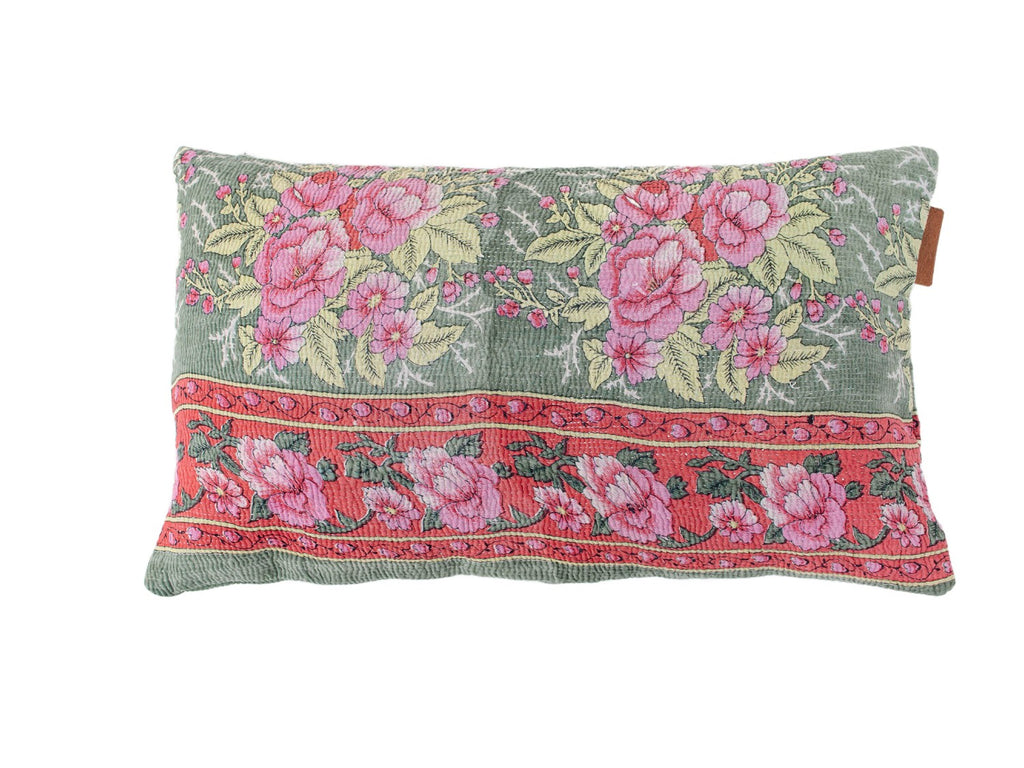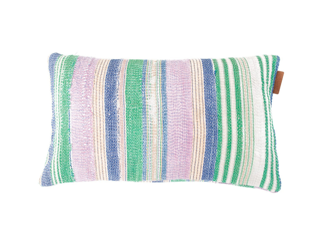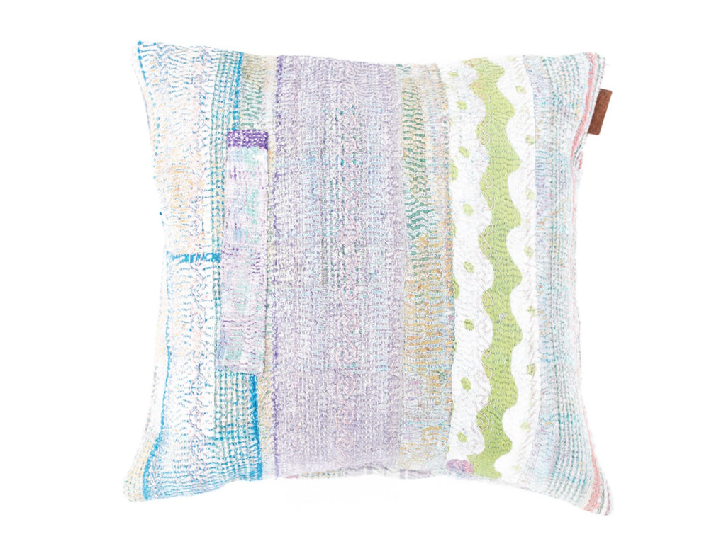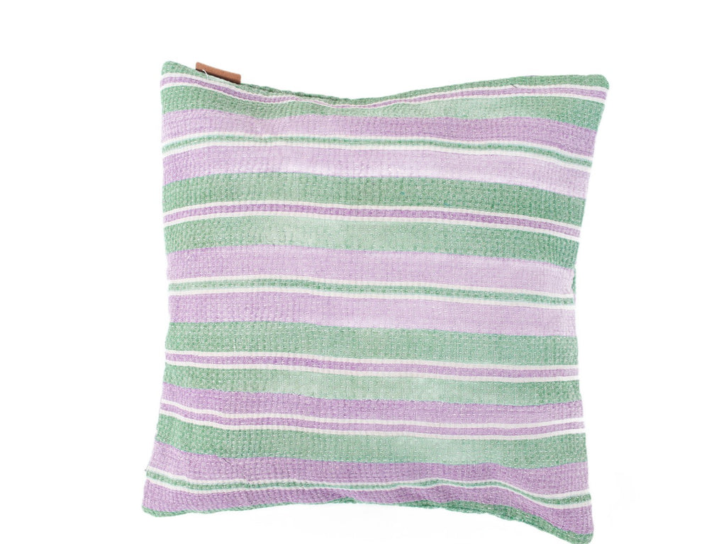 Fine Q sind Sari-Kissen, die aus einer Sari-Art hergestellt werden, die einen anderen Ausdruck hat als unsere normalen Sari-Kantha-Kissen. Sie bestehen aus dickem Sari aus recycelter Baumwolle, der mit mehreren Schichten dazwischen zusammengelegt ist und einen abgenutzten Look aufweist, wobei die Saris im Inneren dazu beitragen, dem gesamten Kissen einen sehr rohen Vintage-Look zu verleihen. Sie sind in Farben und Mustern gedämpft und mit kleineren und engeren Kantha-Stichen genäht, was ihnen ein authentisches Aussehen verleiht.